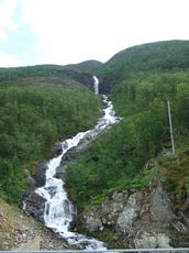 Nahe der E6, aber etwa 30 hm darueber, habe ich eine kleine Kiesflaeche als Schlafplatz ausgewaehlt. Da direkt daneben ein Bach in die Tiefe braust, gab es heute noch eine sehr erfrischende aber auch eisig kalte Naturdusche.