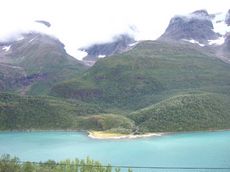 Der Svartisen ist der zweitgroesste Gletscher Norwegens und an diesen Eismassen fuhr ich in kurzer Hose, T-Shirt und Sandalen (wegen des Regens bei der Abfahrt) vorbei. Wie ich fand, war das ein lustiges Bild.