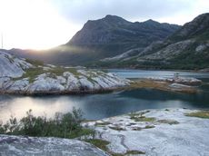 Danach gab es noch eine kurze Faehrfahrt und ein Schiff war es dann auch, das meine Etappe beendete. Genauer gesagt war es das Fehlen des Schiffes. In Jektvik fuhr nach 21 Uhr keine Faehre mehr, also schlug ich etwas ausserhalb des Doerfchens mein Zelt auf.