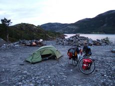 Wer noch nie in Norwegen war, koennte sich denken, dass ich eben einen kleinen Umweg fahren musste. Durch die extrem bergige Landschaft ist Norwegen aber fast ueberall, wo ich bisher war, sehr arm an Strassen. Eine Umfahrung gibt es schlicht und einfach nicht, noch nicht einmal, wenn man mit den Massstaeben eines motorisierten Fahrzeuges messen wuerde.