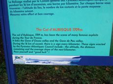 Beim Anstieg am Aubisque steht jeden Kilometer ein Schild und informiert über die restliche Strecke zur Passhöhe.