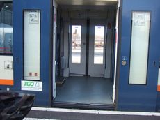 Das sah in Frankreich leider ganz anders aus. Es gibt ja in Zuegen diese Achter-Abteile, zu denen man durch einen schmalen langen Gang entlang einer Fensterseite Zutritt hat. Die Franzosen raeumen die Sitze eines solchen Abteils aus und deklarieren es als Fahrradgarage. Der Gang, durch den man die Raeder transportieren muss, ist etwa zwei Zentimeter schmaler als mein Lenker. Nur durch eine leichte Querstellung des Lenkers kann das Fahrrad in dieses Abteil getragen werden. Sobald das Fahrrad halbwegs steht, muss man dann erneut aus dem Zug rennen und das hoffentlich noch immer da liegende Gepaeck holen. Beim Aussteigen wiederholt sich dann das Spiel in umgekehrter Reihenfolge.